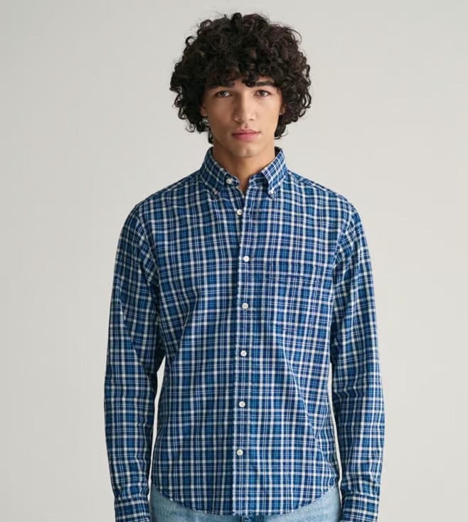 Mens Blue Button Down Collar Full Sleeve Plaid Checks Shirt