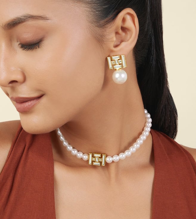 Blue & Cream Necklace With Earring Jewellery Set With Kundan & Pearls