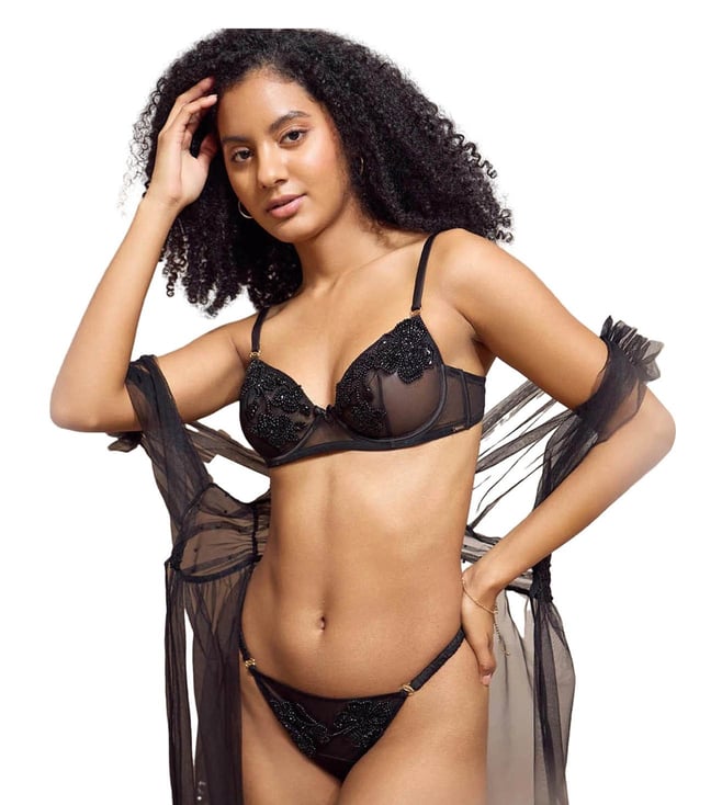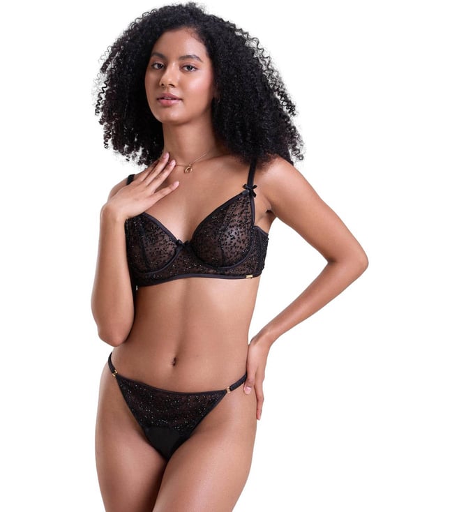 Black Midnight Glow Half Coverage Embellished Non Padded Bra & Thong Set