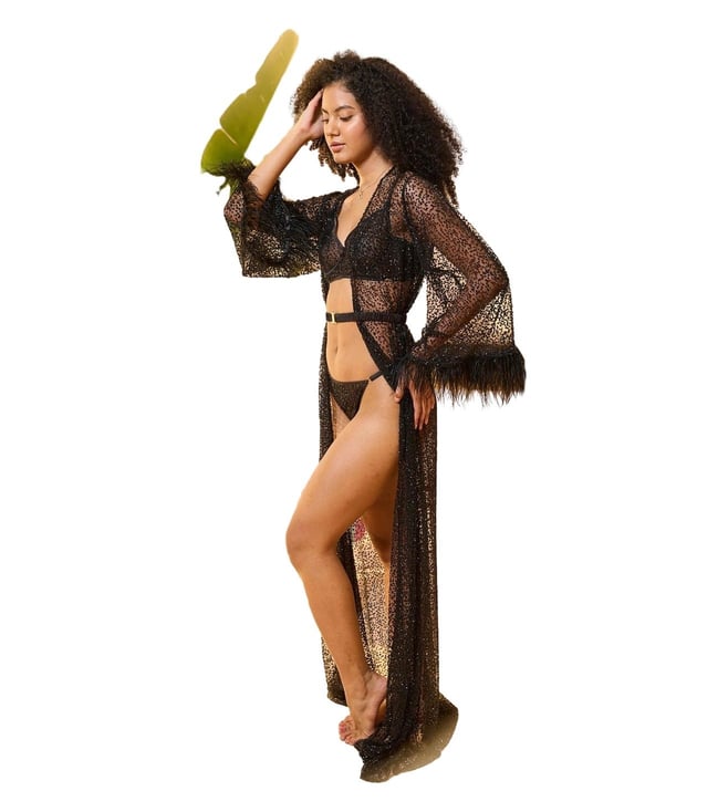Black Midnight Glow Half Coverage Embellished Non Padded Robe & Lingerie Set