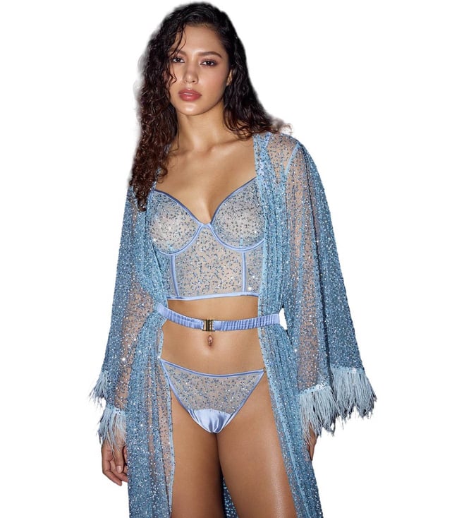 Blue Half Coverage Embroidery Non-padded Bra & Thong Set