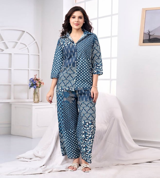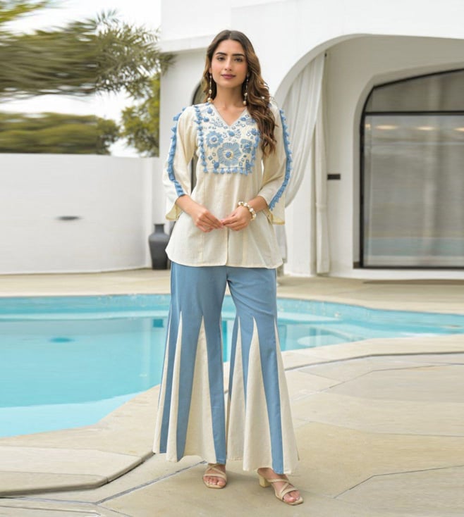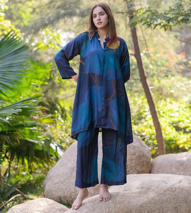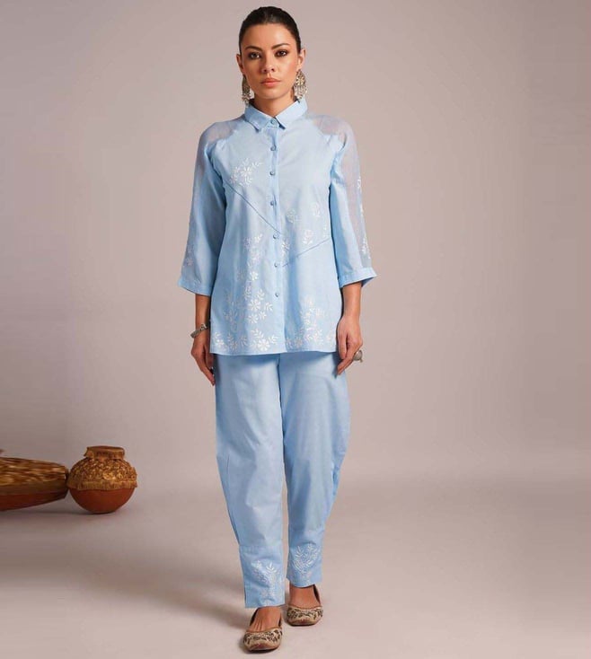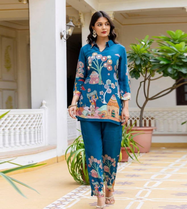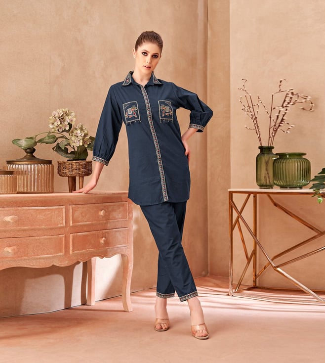 Stravi Dark Blue Embroidered Regular Fit Co-ord Set