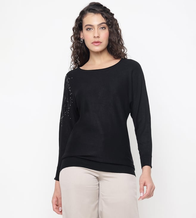 Leslie Basic Stretch Jet Black Embellished Graphic Round Neck Regular Fit Pullover Sweater