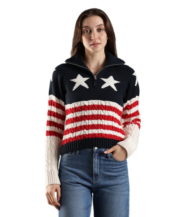 Women Navy Blue Textured Round Neck Regular Fit Sweater