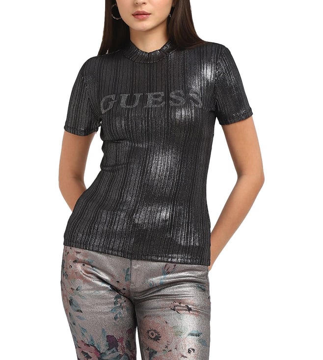 Women's Black Polyester Striped Regular Fit T-Shirt