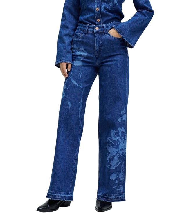 G12 Navy Blue Pleated Mid Rise Extra Wide Leg Fit Denim