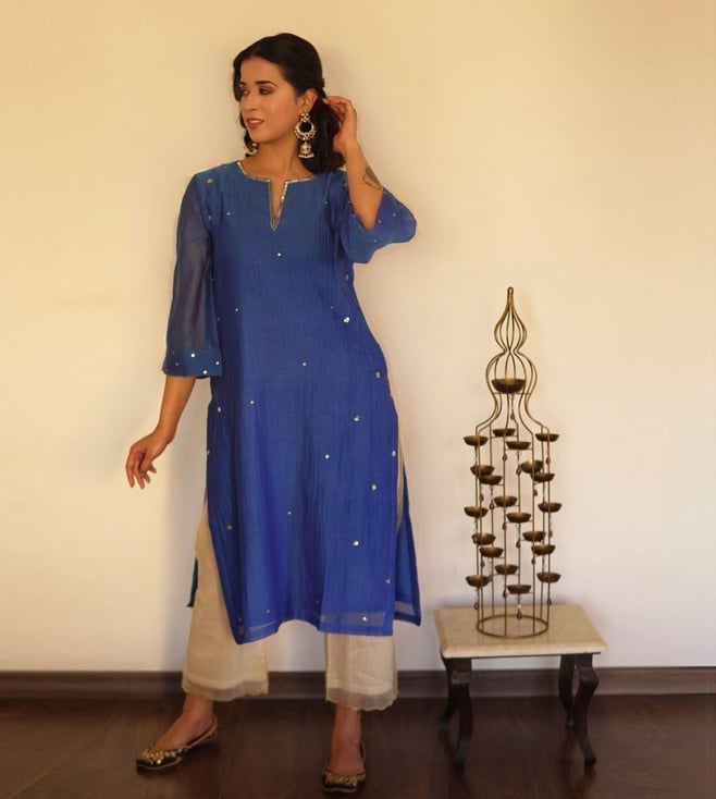 Blue Chanderi Silk A-line Fit Embellished Kurta