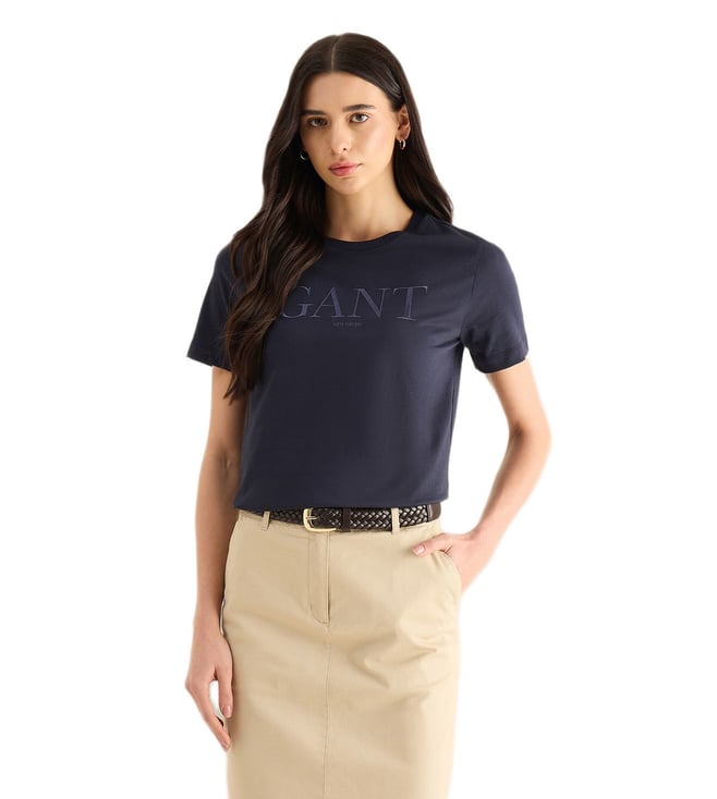 Women Navy Blue Logo Slim Fit Crew Neck T-Shirt