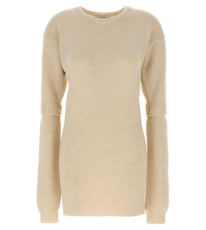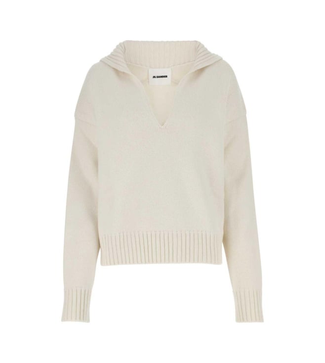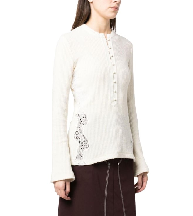 White Knitted Split-Neck Woven Design Jumper
