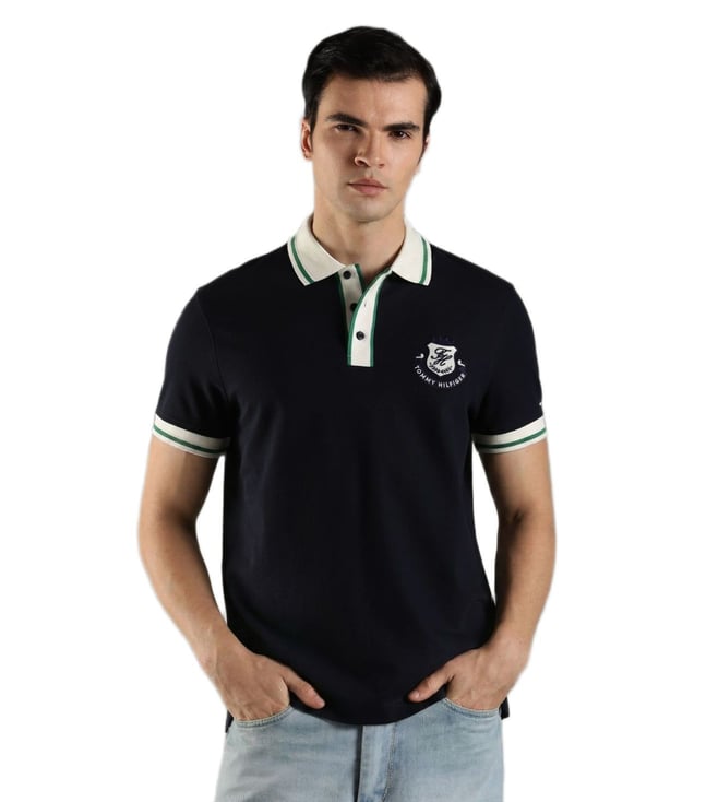 Navy Cotton Regular Fit Solid Polo T-Shirt