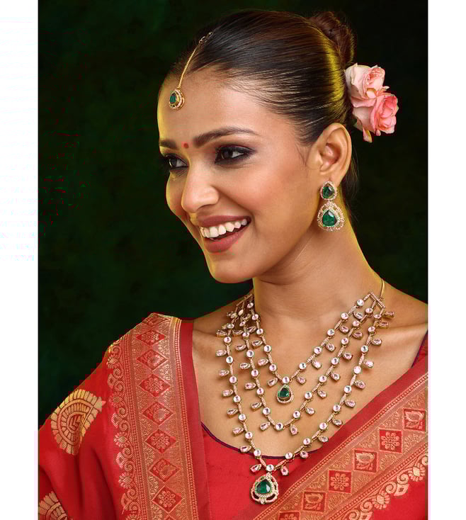 Layered Kundan And Emerald Necklace With Earrings And Maang Tikka