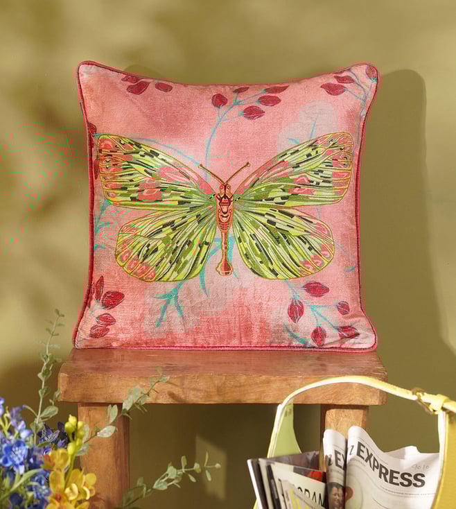 Pink Velvet Butterfly Print Square Cushion Cover