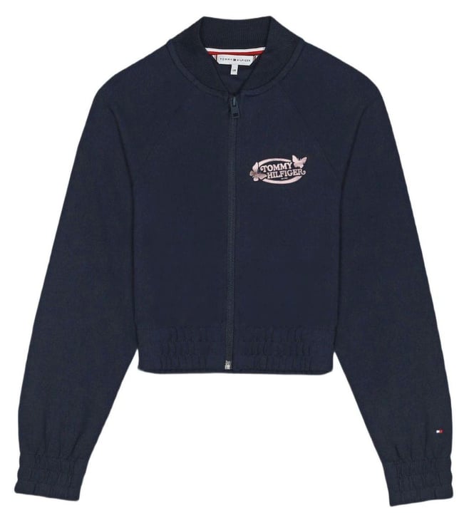 Girls Black Logo Printed Comfort Fit Zip-Up Hoodie