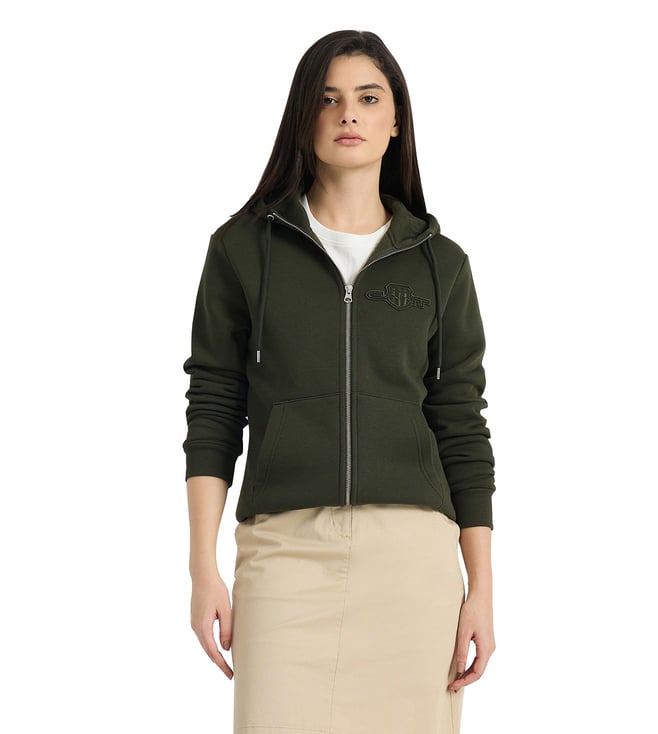 Women Dark Green Tonal Shield Zip Hooded Sweatshirt