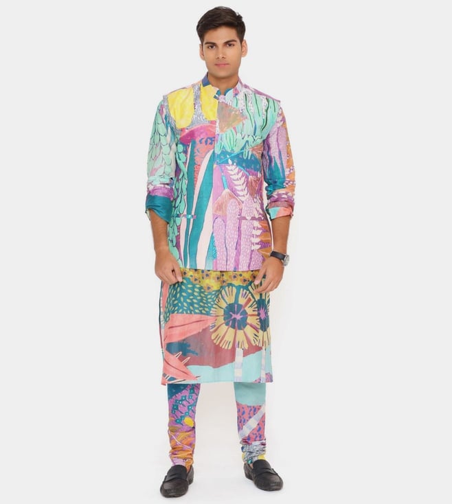 Blue Gustav Painterly Print Dupion Silk Pathani Kurta With Jogger Pants