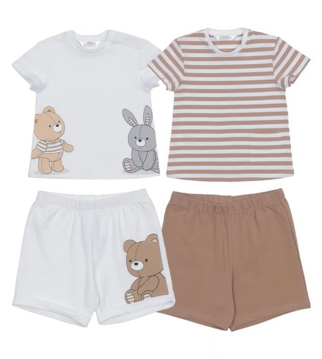 Kids White & Beige Bear Printed 2Pc Shorts Set