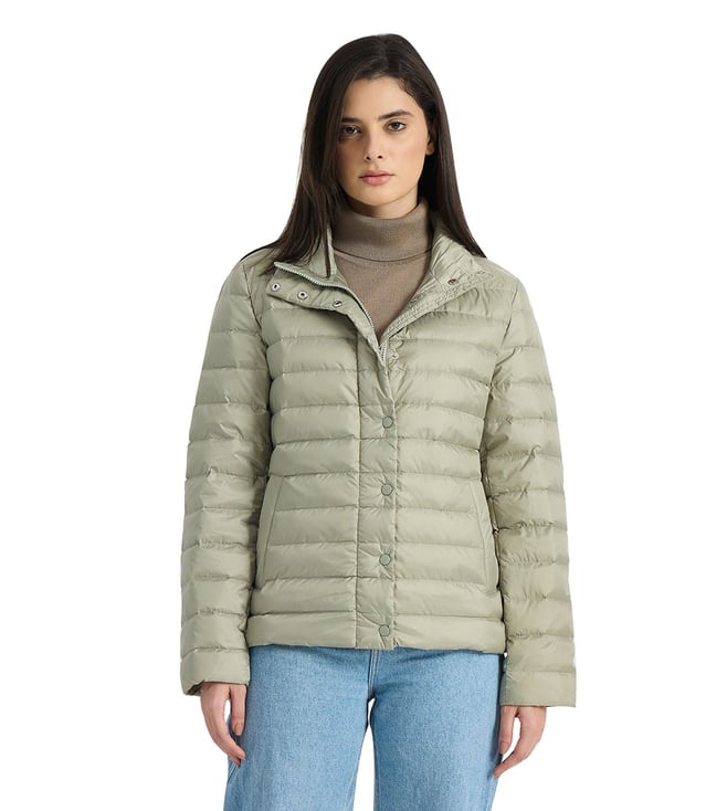 Women Green Quilted Stand Collar Regular Fit Jacket