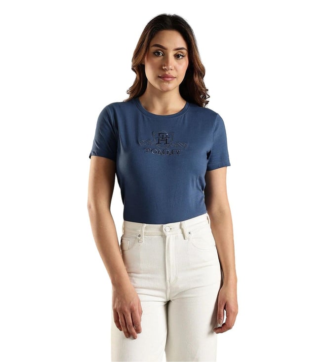 Blue Cotton Regular Fit Logo Printed T-Shirt