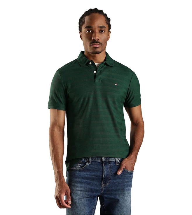 Dark Green Cotton Regular Fit Self Pattern Polo T-Shirt