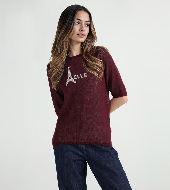 Women Red Textured Round Neck Pure Cotton T-Shirt