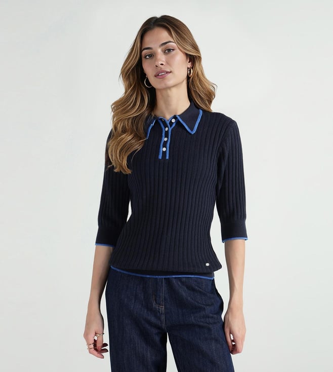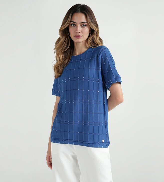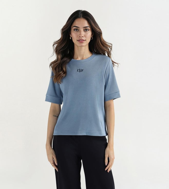 Women Blue Textured Crew Neck Pure Cotton T-Shirt