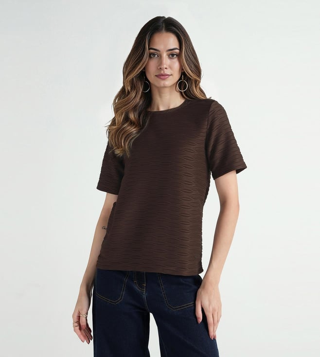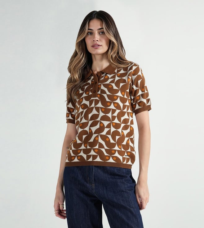 Women Brown Geometric Pattern Collar Pure Cotton T-Shirt