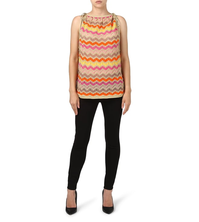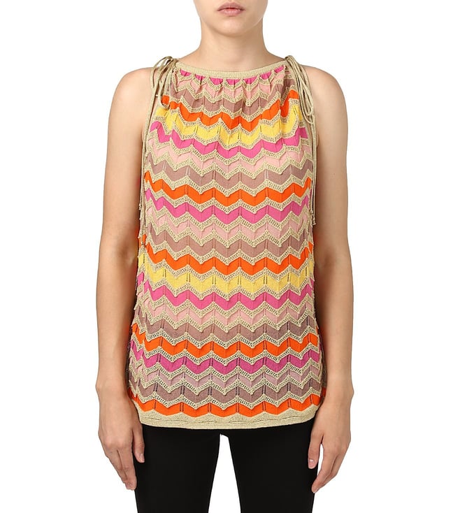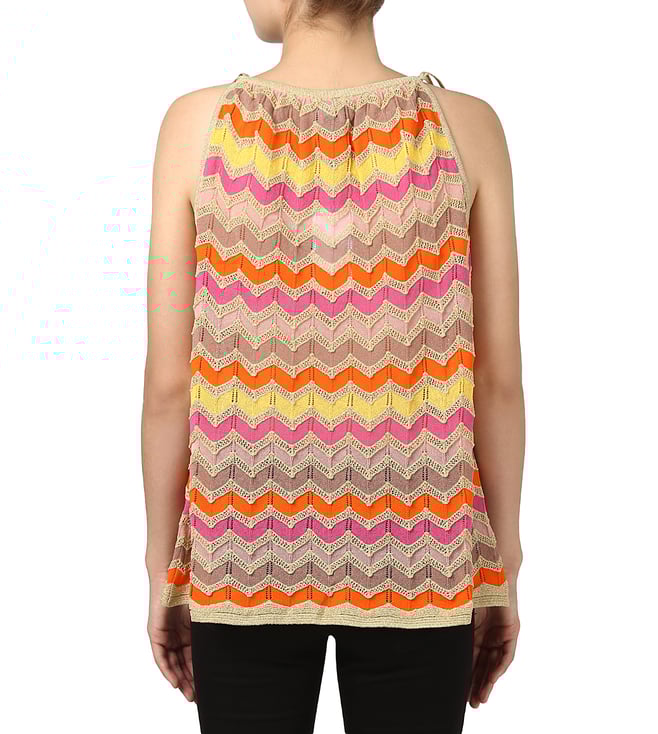 The rainbow of colorful chevron waves and the citrusy orange hue of this top from M Missoni will give you a delicious style treat. Styled with knots on the shoulders, this top has crocheted raised chevrons and vertical hollowed-out panels all over that give it gritty edge. With its metallized fiber inserts, this top will look gorgeous with skinny jeans and stilettos to get a statement look.