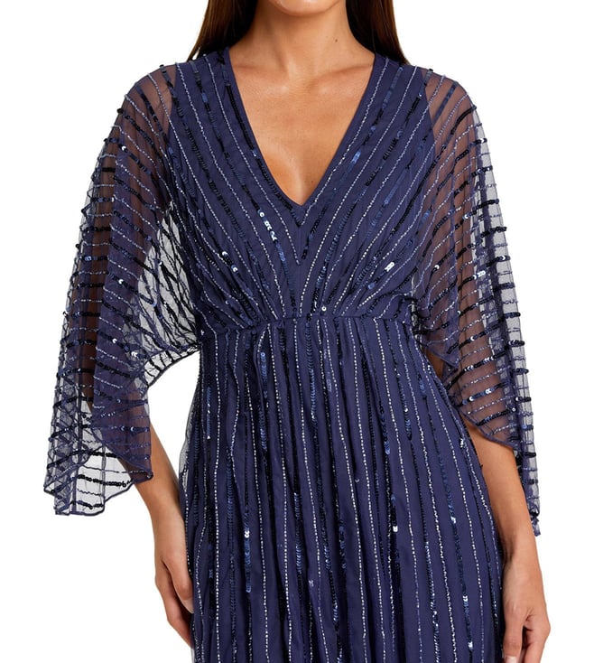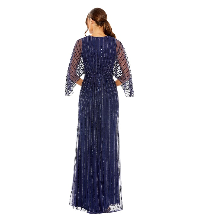 MAC DUGGAL Navy Blue Beaded Striping Kimono Embellished Comfort Fit Gown