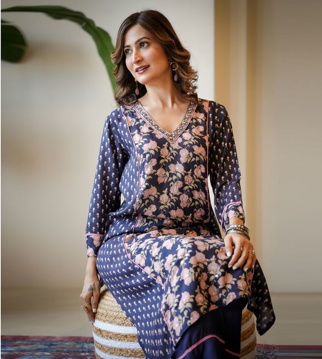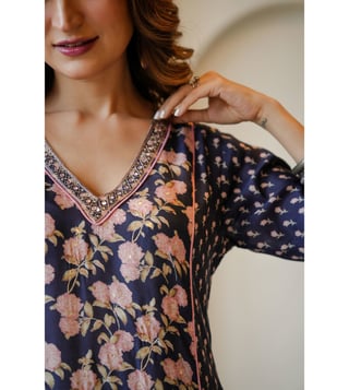 Blue and Pink Spread Gota Work V Neck with Panel Block Print Kurta Pant Set