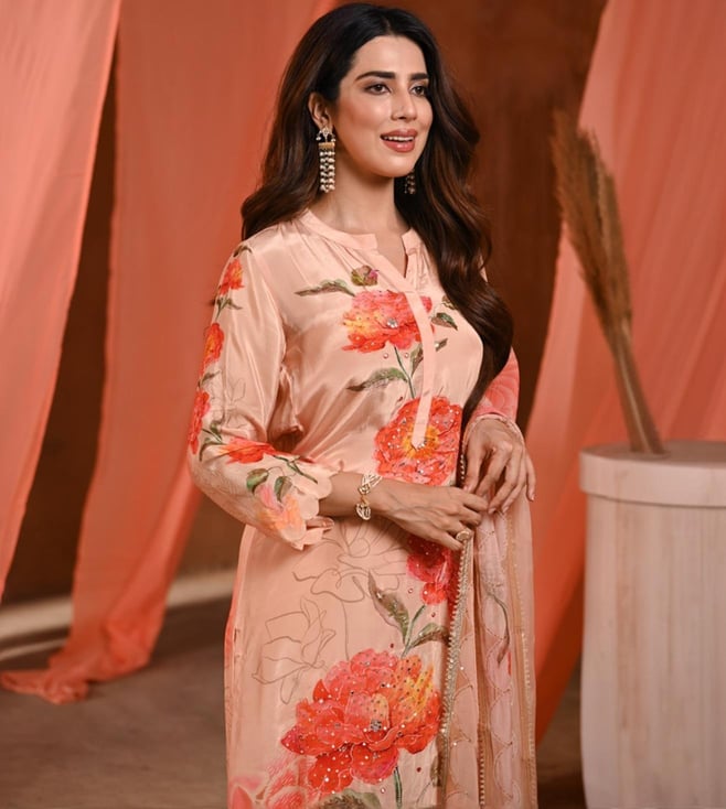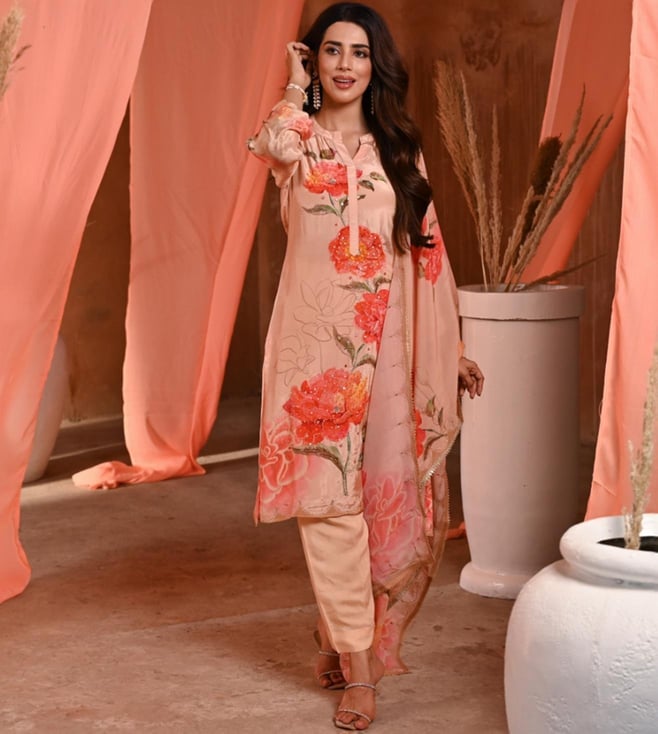 Mahee Jaipur Peach Floral Print Crepe Kurta with Pant and Scallaop Gota and Tari Work Dupatta