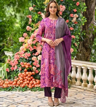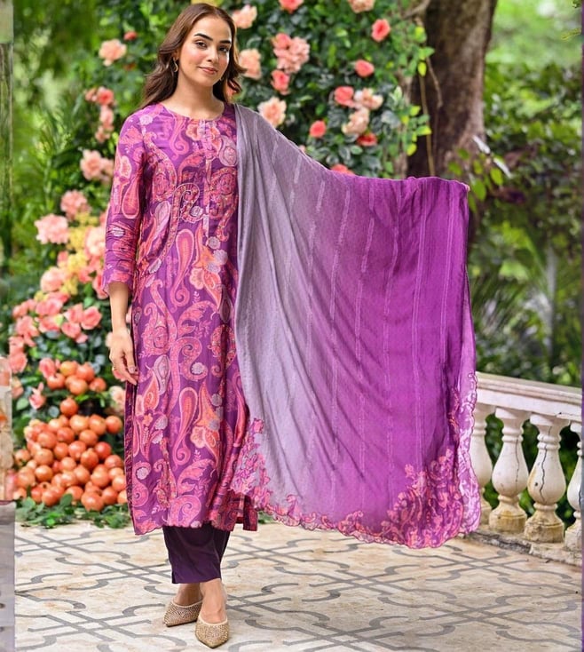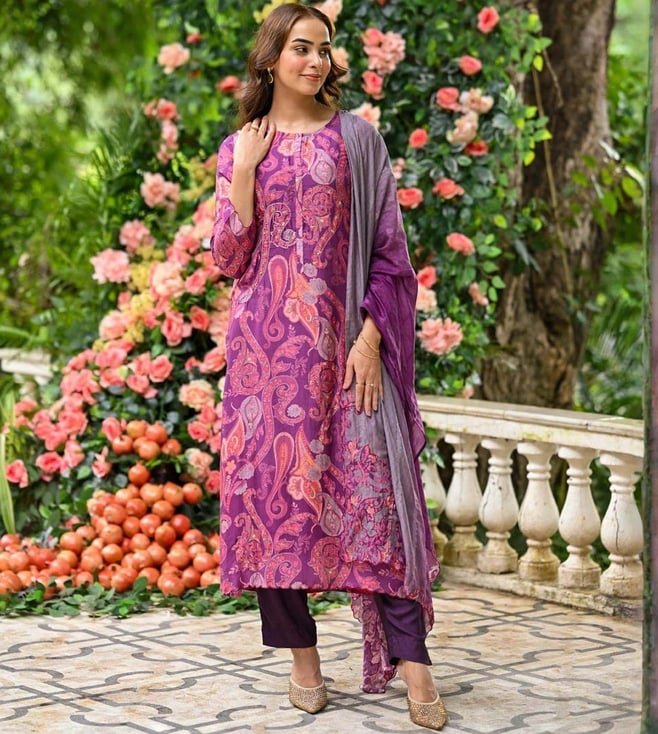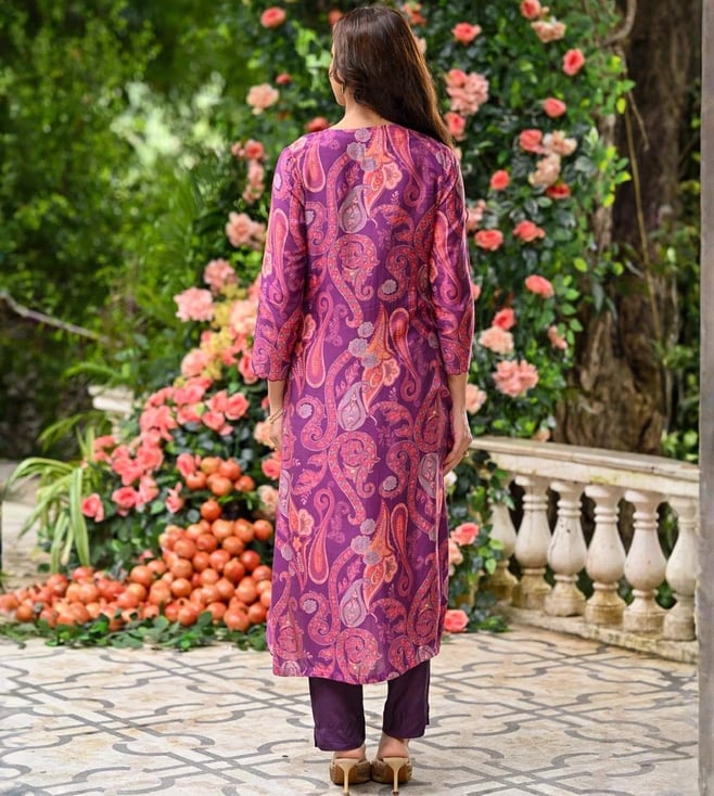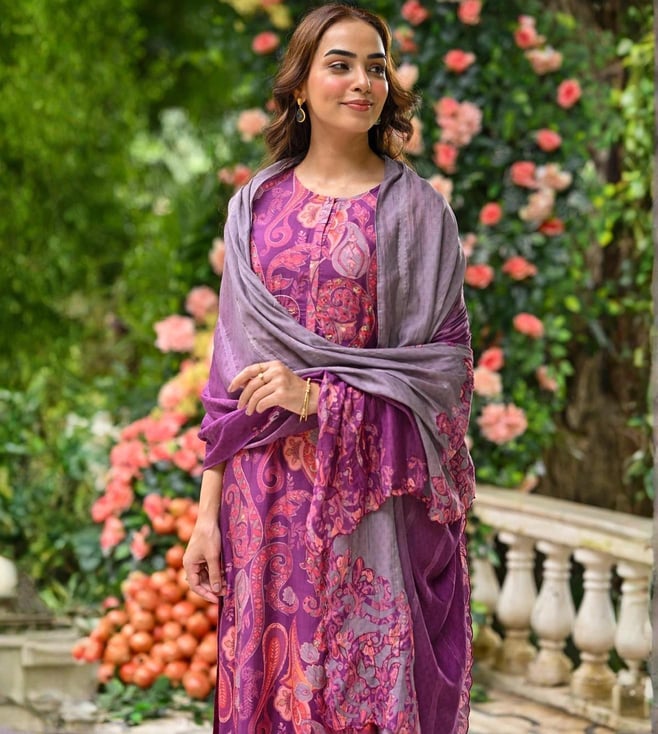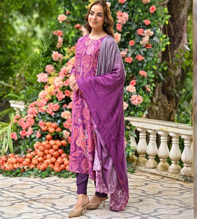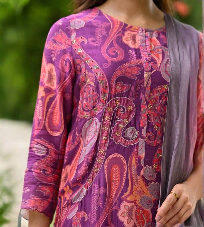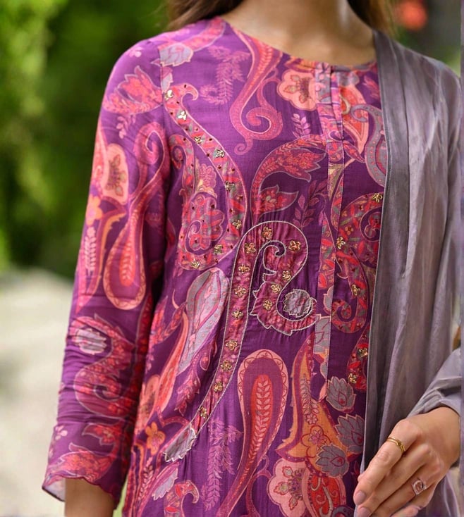 Mahee Jaipur Purple Paisley Pure muslin Suit Set with Zari Thredle work Kurta And Pant