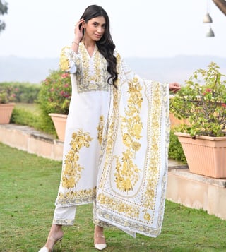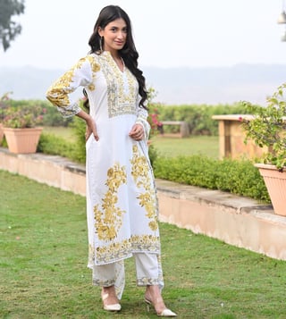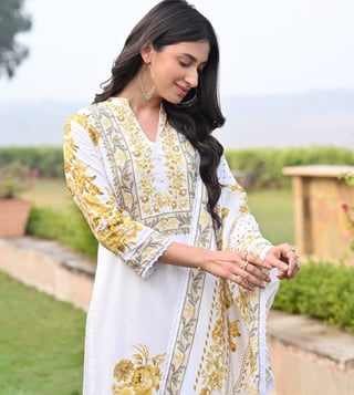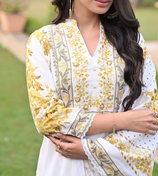 Embrace the sunshine in this vibrant yellow kurta set, crafted from soft mul cotton. The intricate printed design adds a touch of elegance, while the three-quarter sleeves and mandarin neck offer a flattering silhouette. The comfortable mul cotton fabric ensures a breezy and breathable feel, perfect for warm days. This set is a versatile choice for any occasion, from casual outings to festive celebrations.