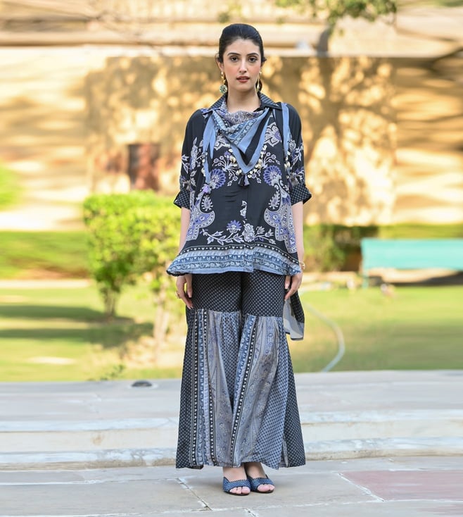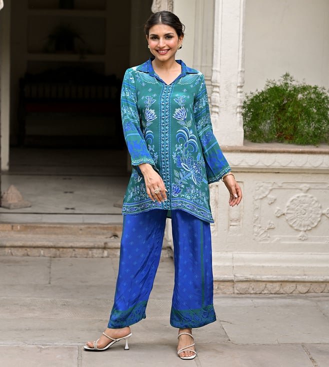 Blue Brush Floral Print Shirt with Pant Co-ord Set