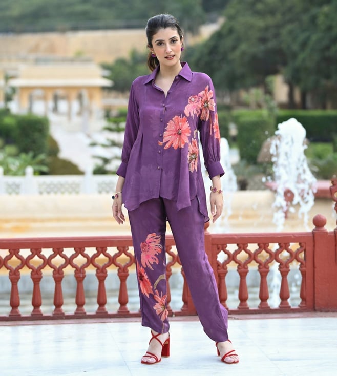 Purple Spectacular Floral Print Placement Pure Crepe Top with Pant Coordinated Set