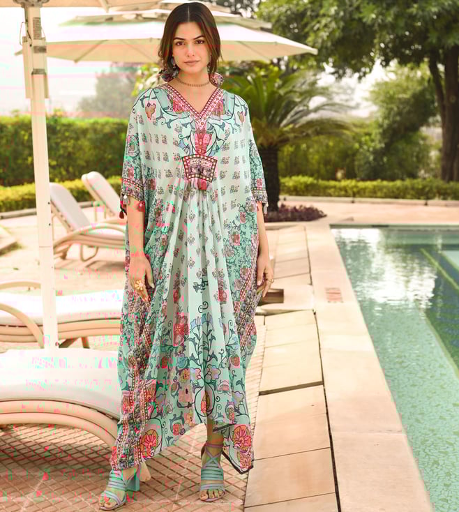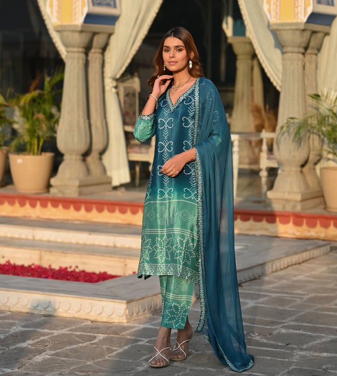 Rama Green Jashn Block Floral Print Chanderi Kurta with Pant and Dupatta