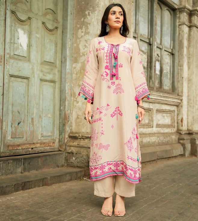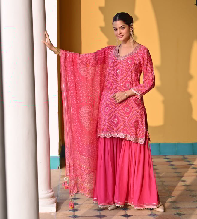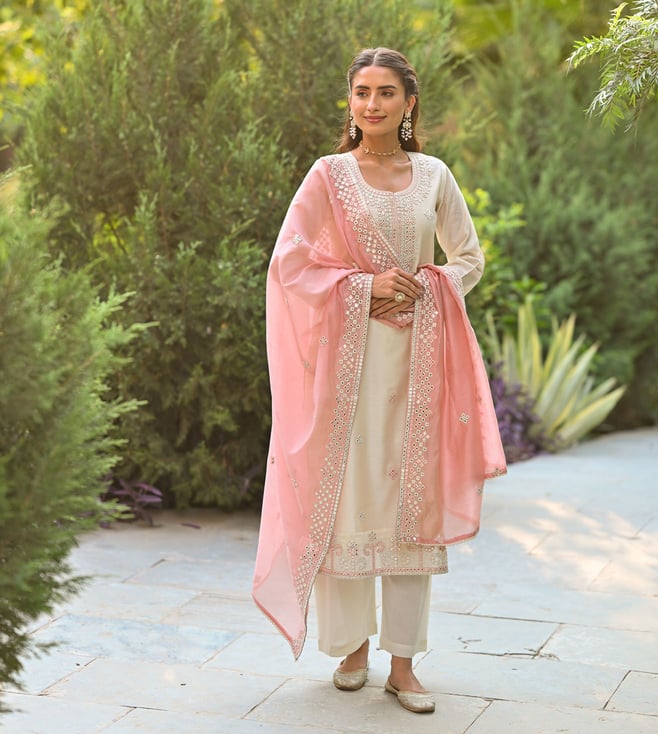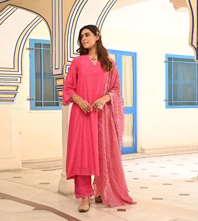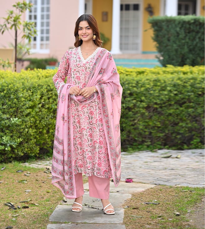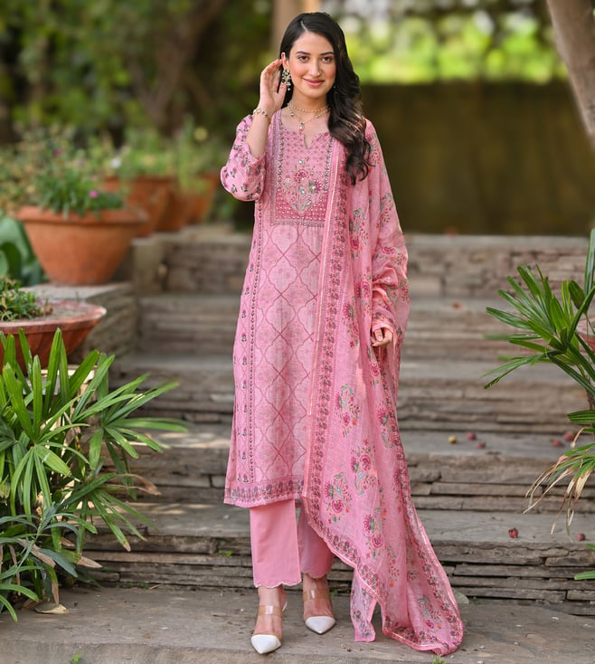 Pink Floral print Suit Set with Sequin , Mirror and Zari work Kurta With Pant And Dupatta