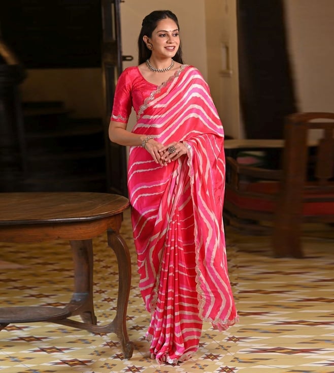 Purple Brush Floral Print Scallope Mirror Borders Pure Crepe Saree