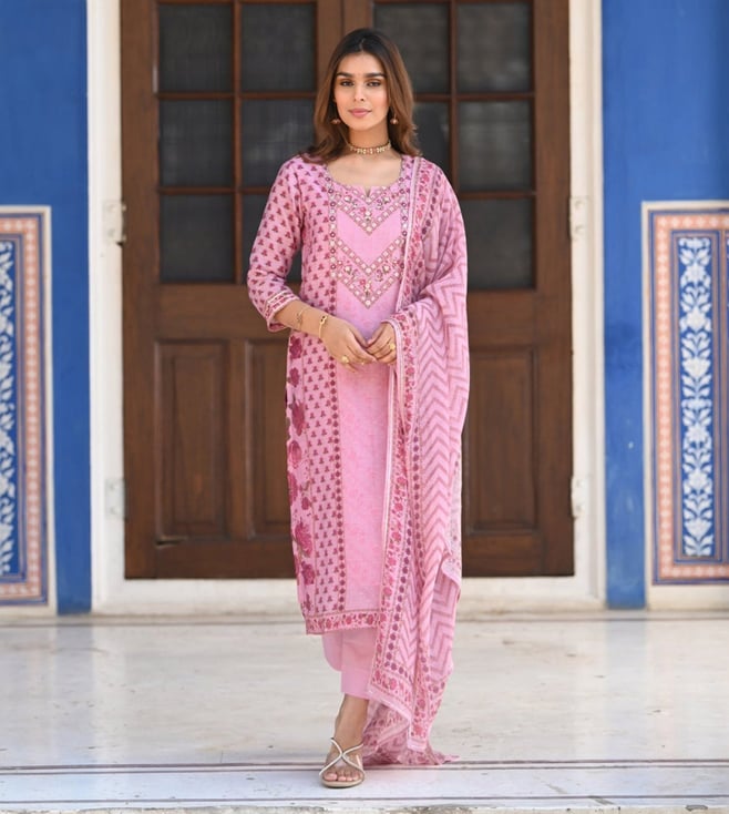 Pink Floral print Suit Set with Sequin , Mirror and Zari work Kurta With Pant And Dupatta
