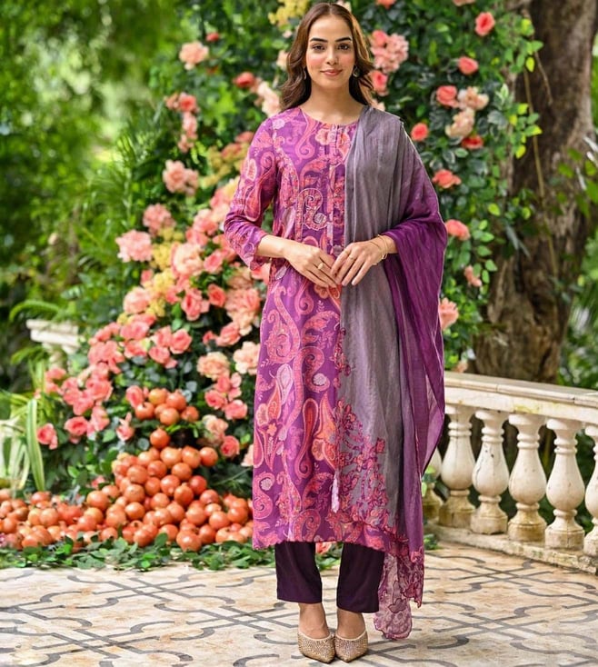 Purple Paisley Pure muslin Suit Set with Zari Thredle work Kurta And PantWith Shaded Cut work Dupatta