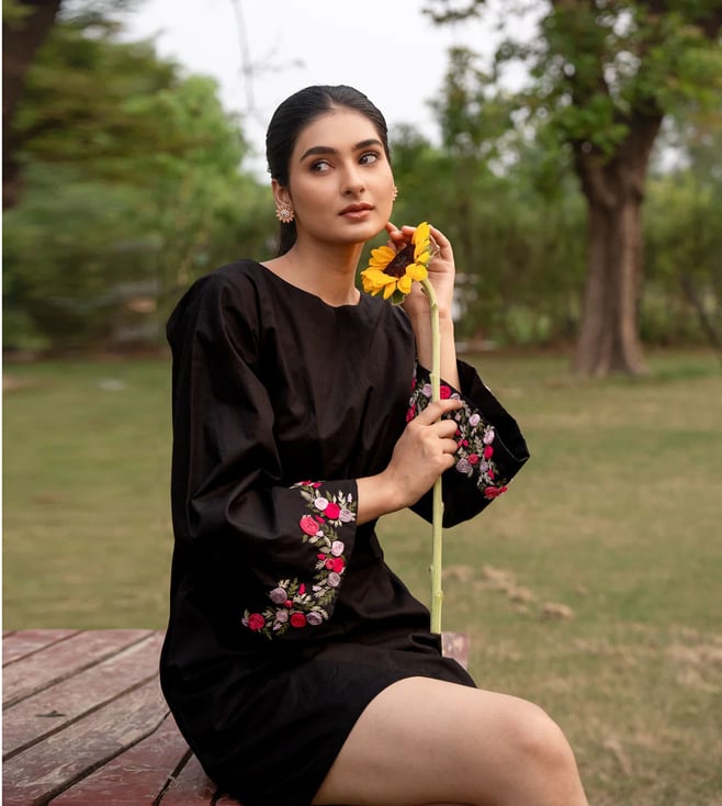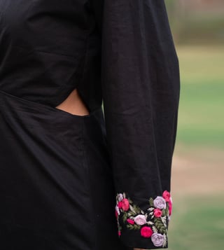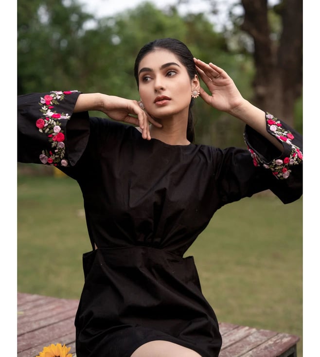 A tasteful black cotton dress featuring exquisite cotton thread embroidery on the sleeves. She is perfect for any occasion, it adds elegance and sophistication to your wardrobe. The convenient side pocket on this dress is perfect for carrying your essentials without sacrificing style. The intricate details and high-quality fabric make it a must-have for any fashionista. Elegant yet classy short dress with a modern silhouette. Small side cut-out at the waist for a playful, flirty touch. Bell sleeves adorned with exquisite embroidery, adding a graceful, artisanal detail.