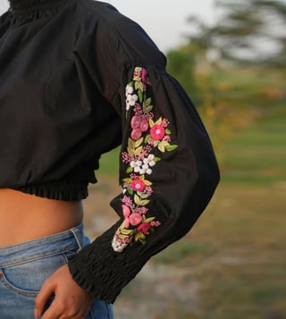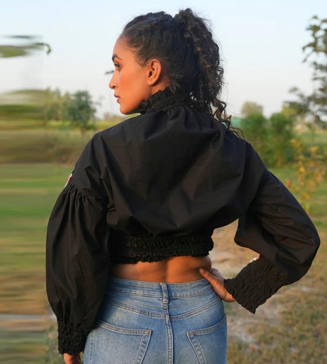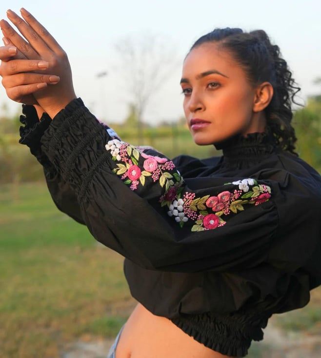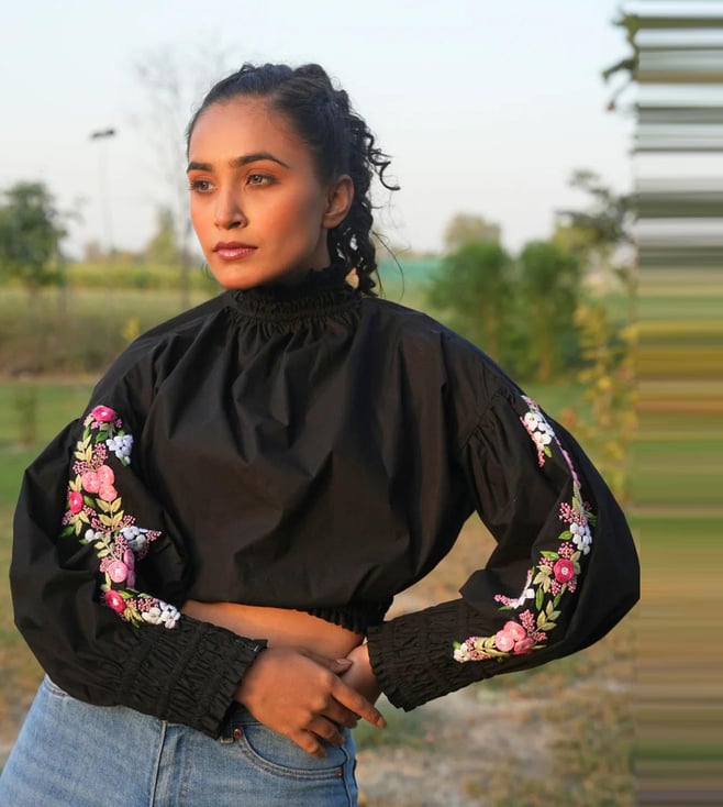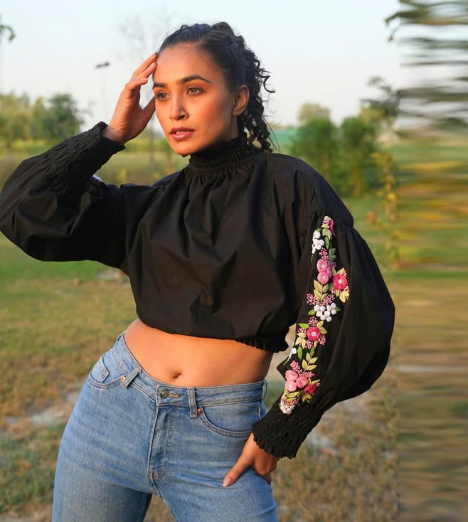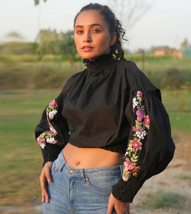 She is the high-neck crop top that's perfect for any occasion. Made with comfortable cotton and featuring unique embroidery on the sleeves, this top is stylish and versatile for both parties and casual wear.
