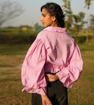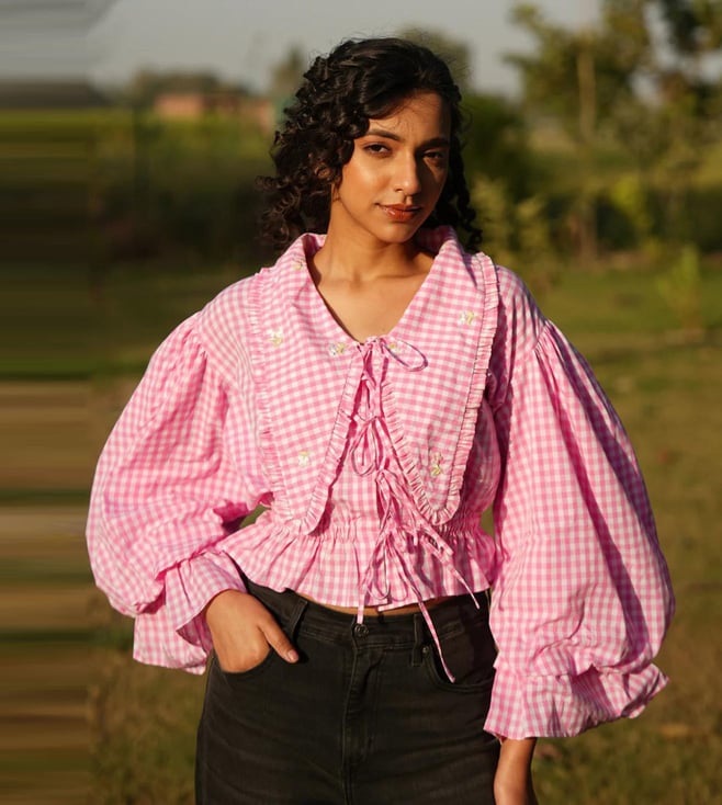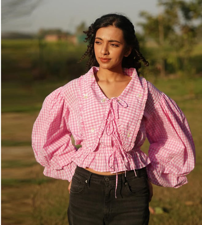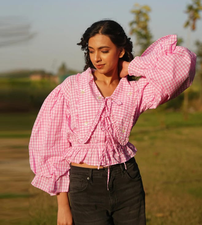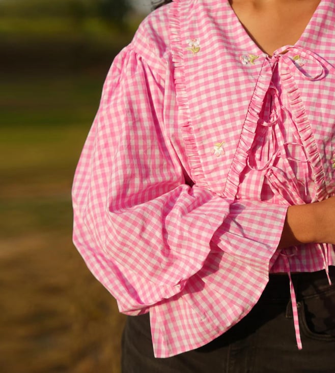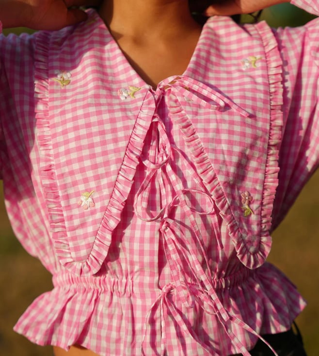The Raya Ruffle Top is a charming blend of comfort and style. With its pink gingham pattern, delicate ruffle detailing, and hand-embroidered accents, it offers a feminine silhouette. The gathered waist and tie-up front add a playful touch, perfect for pairing with jeans or a skirt for a casual yet polished look.