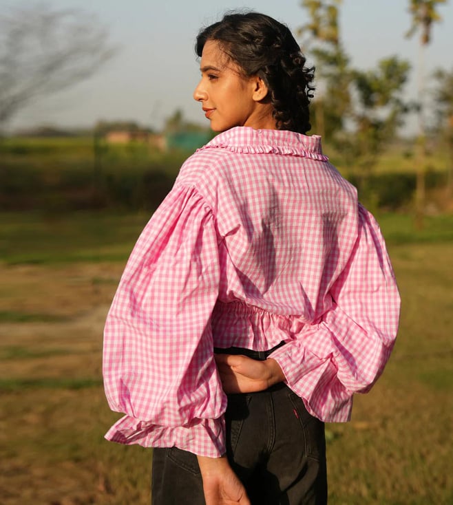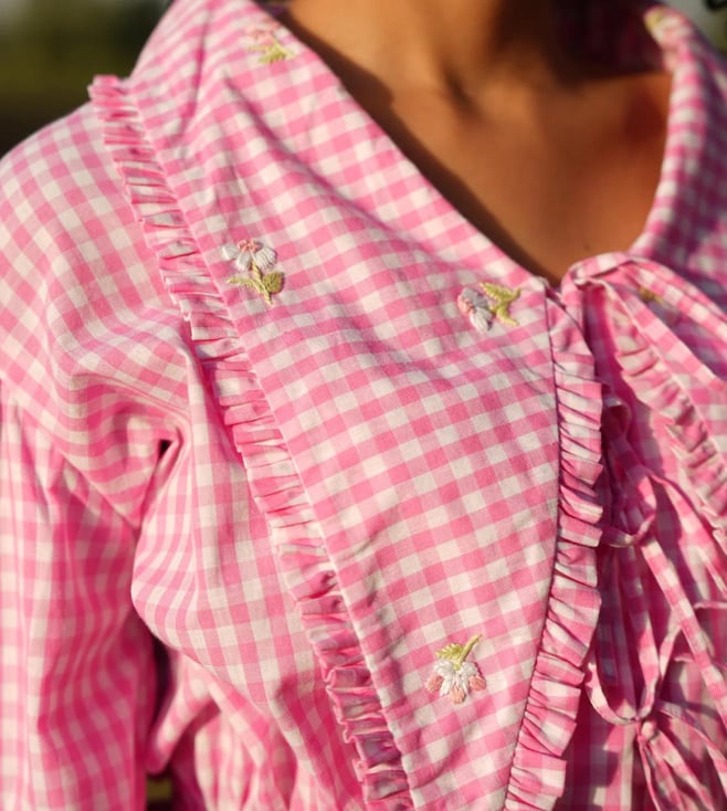 MAI India Pink & White Checks Cotton Relaxed Fit Hand Embroidery Tops & Tunic