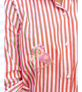 Get ready to turn heads with her, the super comfortable shirt dress adorned with charming hand embroidered birdies. Plus, we've got you covered with convenient pockets. Glam up your style with Elina today! Perfect for summer with elegant stripes, combining comfort and sophistication. Relaxed fit that offers a flattering, easy-going silhouette. Delicate hand-embroidered birds add an artisanal touch. Pearl button-down front for a refined, effortless look. 3/4 sleeves that can be rolled up for a polished, smart appearance. Classic collared neckline for a timeless, chic vibe.