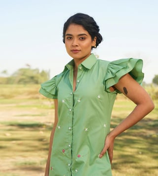 She features delicate floral hand-embroidery adding a unique touch of craftsmanship. Made from pure cotton fabric, it's both comfortable and breezy, perfect for summery days. With effortless style and charm, it's sure to catch everyone's eye! A cute, summery mini dress designed for effortless charm Relaxed comfort fit, detailed with delicate hand-embroidered flowers Pearl button-down front adds ease and a refined touch Ruffled short sleeves bring a playful, feminine flair Classic collared neckline for a crisp, structured finish. Side pockets for added functionality and convenience.