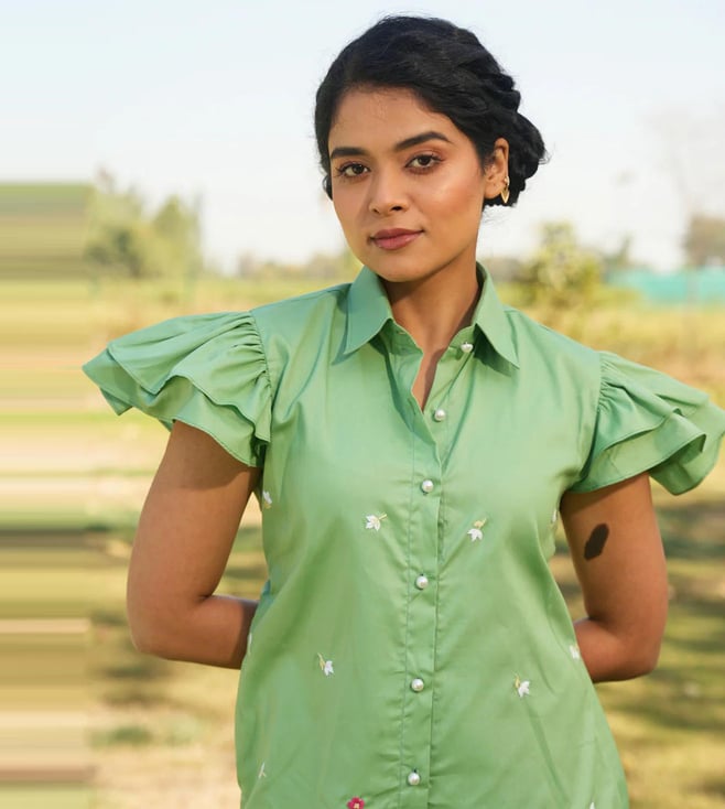 MAI India Sage Green Cotton Relaxed Fit Hand Embroidery Dress