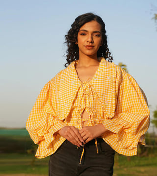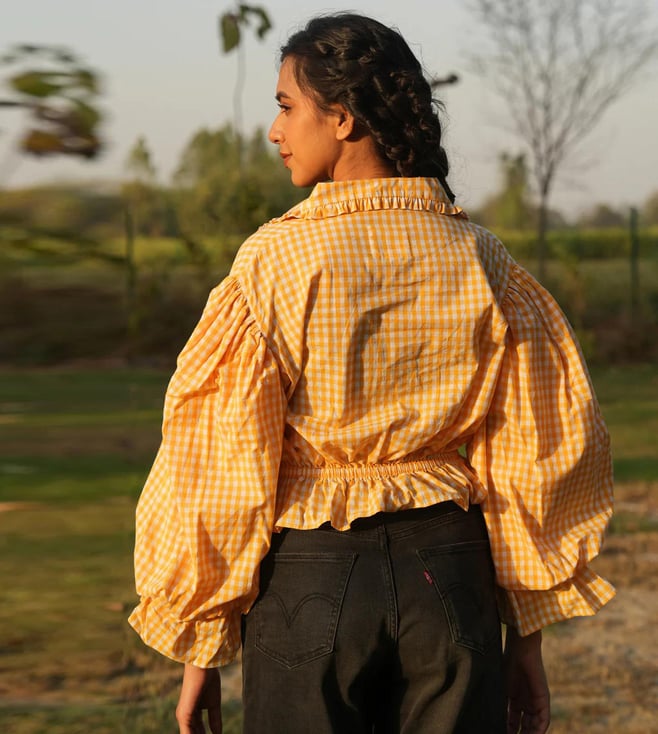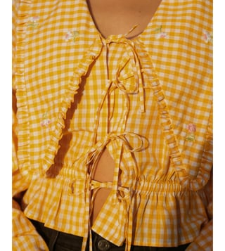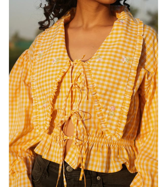 MAI India Yellow & White Checks Cotton Relaxed Fit Hand Embroidery Tops & Tunic