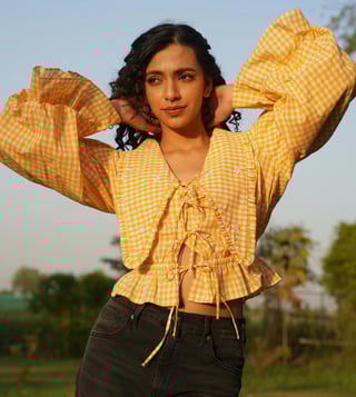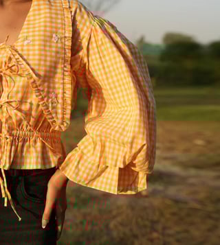The Raya Ruffle Top is a charming blend of comfort and style. With its pink gingham pattern, delicate ruffle detailing, and hand-embroidered accents, it offers a feminine silhouette. The gathered waist and tie-up front add a playful touch, perfect for pairing with jeans or a skirt for a casual yet polished look.