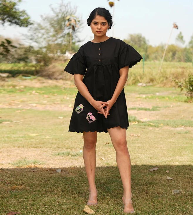 Black Cotton Relaxed Fit Hand Embroidery Dress