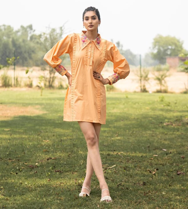 Orange Cotton Relaxed Fit Hand Embroidery Dress